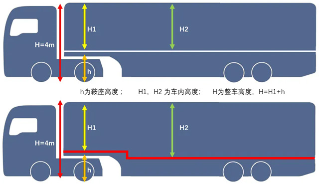 理論上車軸越多,鞍座載荷越大,如:4X2和4X4牽引車頭,一般鞍座載荷為9~11噸;6X2和6X4牽引車頭,一般鞍座載荷能夠達到17~18噸;不同廠家,不同配置,鞍座載荷略有不同。在設(shè)計布局時,一般選用4X2牽引車頭就夠用,但如果車前部重量比較大,建議選擇6X2以上牽引車頭,具體以轉(zhuǎn)播車制造商提供的車輛配重計算為準。