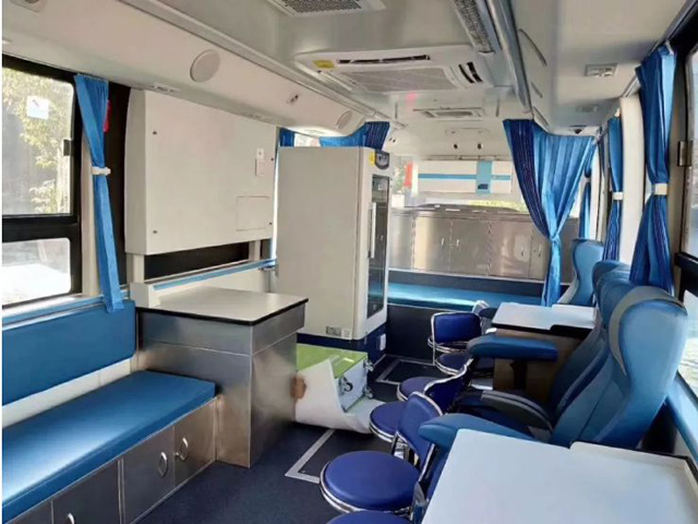 配置鋰電池系統(tǒng)的9米長的采血車,取消了傳統(tǒng)發(fā)動機的供電用鋰電池完全代替??梢詽M足一天8小時的采血工作需求,鋰電池放置在下面的行李艙里面。后面這個就是整個的一個電池塊。大概有60度的電。內(nèi)飾進行了升級,包括它的風道,頂棚,包層柱都做了一個商務改造。車廂的布局符合獻血流程。采血區(qū)域一共有四個采血位,可以四個人同時采血。旁邊是登記跟初篩的工作臺。負責給采血的人進行登記。檢測血型,做簡單的初篩。