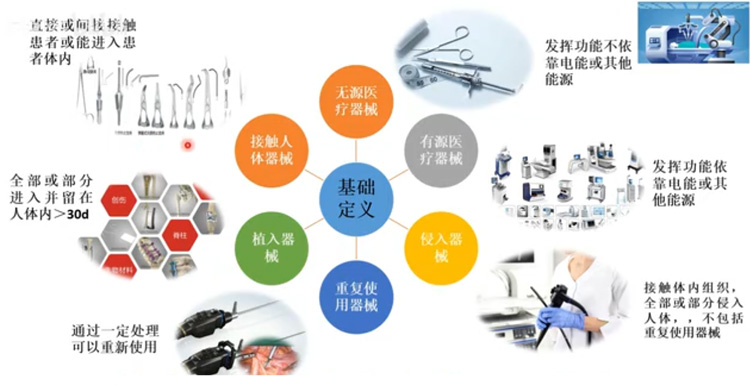 主要定義、風(fēng)險程度、結(jié)構(gòu)、接觸人體、使用形式、醫(yī)療效果和使用時限。首先是醫(yī)療器械的基礎(chǔ)定義,主要是根據(jù)醫(yī)療器械的機(jī)構(gòu)和功能特點(diǎn)來進(jìn)行劃分的。無源醫(yī)療器械不依靠電能或者其他能源,通過人體使用,發(fā)揮其功能的醫(yī)療器械。沒有動力源的醫(yī)療器械,有注射器,手術(shù)刀。有源醫(yī)療器械任何依靠電能或者其他能源,常見的有超聲影像設(shè)備DR、CT、醫(yī)療機(jī)器人等。侵入器械,接觸體內(nèi)組織身體內(nèi)部位的醫(yī)療器械。通過體表侵入人體介入手術(shù)使用的器材、一次性無菌手術(shù)器械暫時或者短期留在人體的醫(yī)療器械。侵入器械不包括重復(fù)使用的手術(shù)器械,我們常見的有,注射器和針頭,胃腸鏡、尿管、骨科耗材等。重復(fù)使用器械用于手術(shù)中進(jìn)行切割鉆鋸抓刮鉗抽夾等等過程。不連接任何有源醫(yī)療器械。通過一定的處理可以重新使用的無源醫(yī)療器械。常見的有:腹腔鏡、喉鏡、胃腸鏡等。植入器械,借助手術(shù)全部或者部分進(jìn)入體內(nèi)或者腔道里面。或者用于替代人體上皮、眼表面,術(shù)后留在體內(nèi)一個月以上的。被人體吸收的醫(yī)療器械。常見的有心臟起搏器、心臟支架、人工關(guān)節(jié)、腦起搏器、口腔種植等。接觸人體器械:進(jìn)入體內(nèi)的醫(yī)療器械。醫(yī)用注冊器,手術(shù)到、內(nèi)窺鏡、起搏器。大部分屬于接觸人體醫(yī)療器械范疇的。